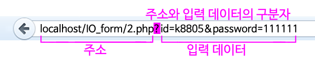 위의 코드로 만들어진 에플리케이션이 http://localhost/IO_form/2.php라고 한다면 URL을 아래와 같이 만들어서 주소창에 입력해보자.
