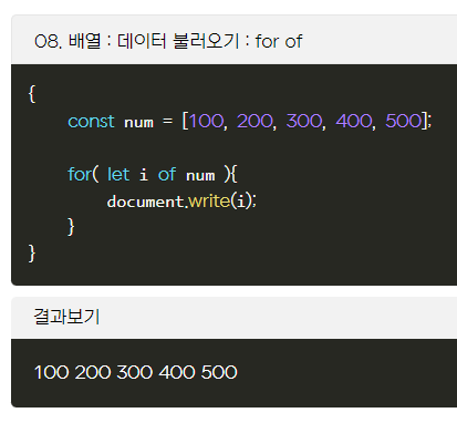 for of 반복문은 배열의 값을 불러올 수 있는 반복문 입니다.