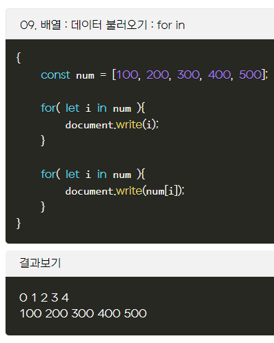 자바스크립트에서는 배열도 객체이기 때문에 for in은 배열의 인덱스 값을 key값으로써 불러옵니다.